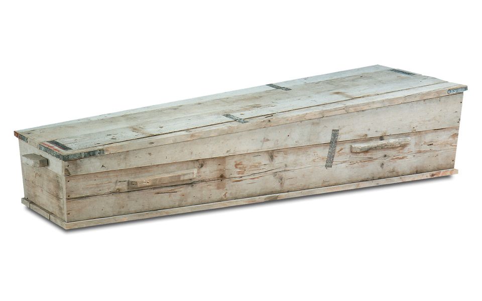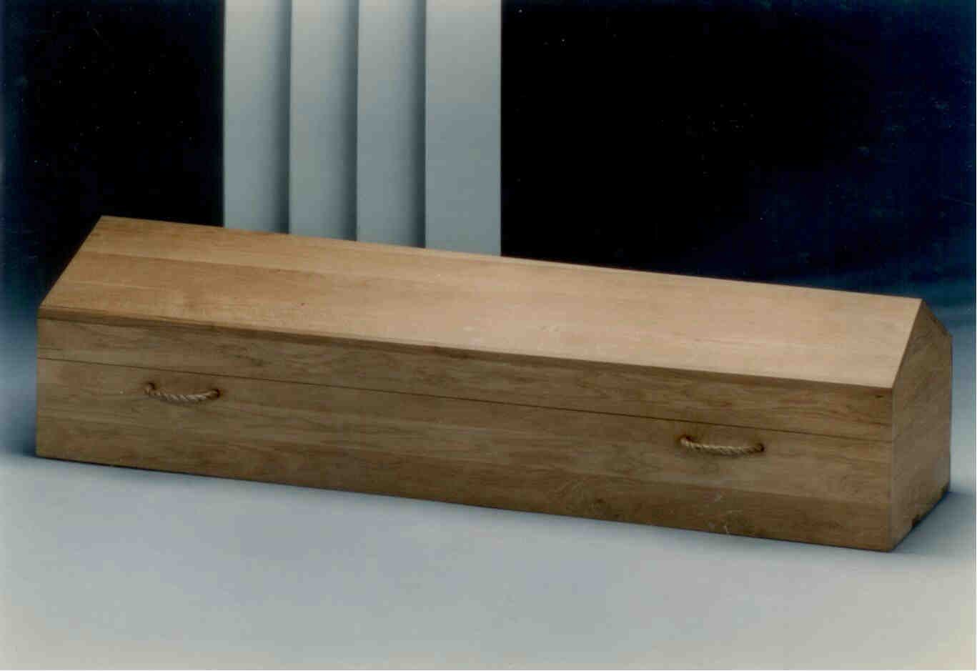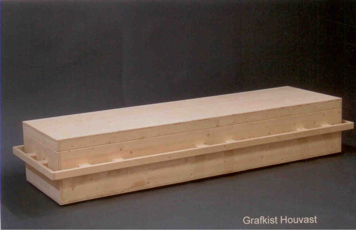 Ongeschaafd massief vurenhout. Sluiting door een houten pen aan hoofd- en voeteneind.