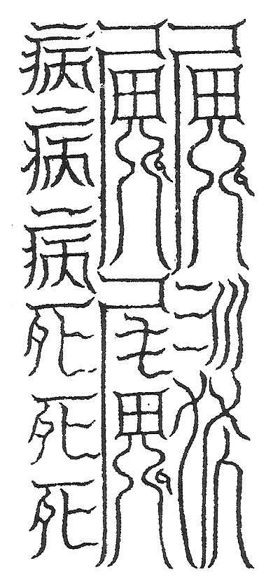 Talisman om de hemelse bureaucratie om de tuin te leiden. Links zijn de karakters bing si (‘aan ziekte gestorven’) leesbaar.