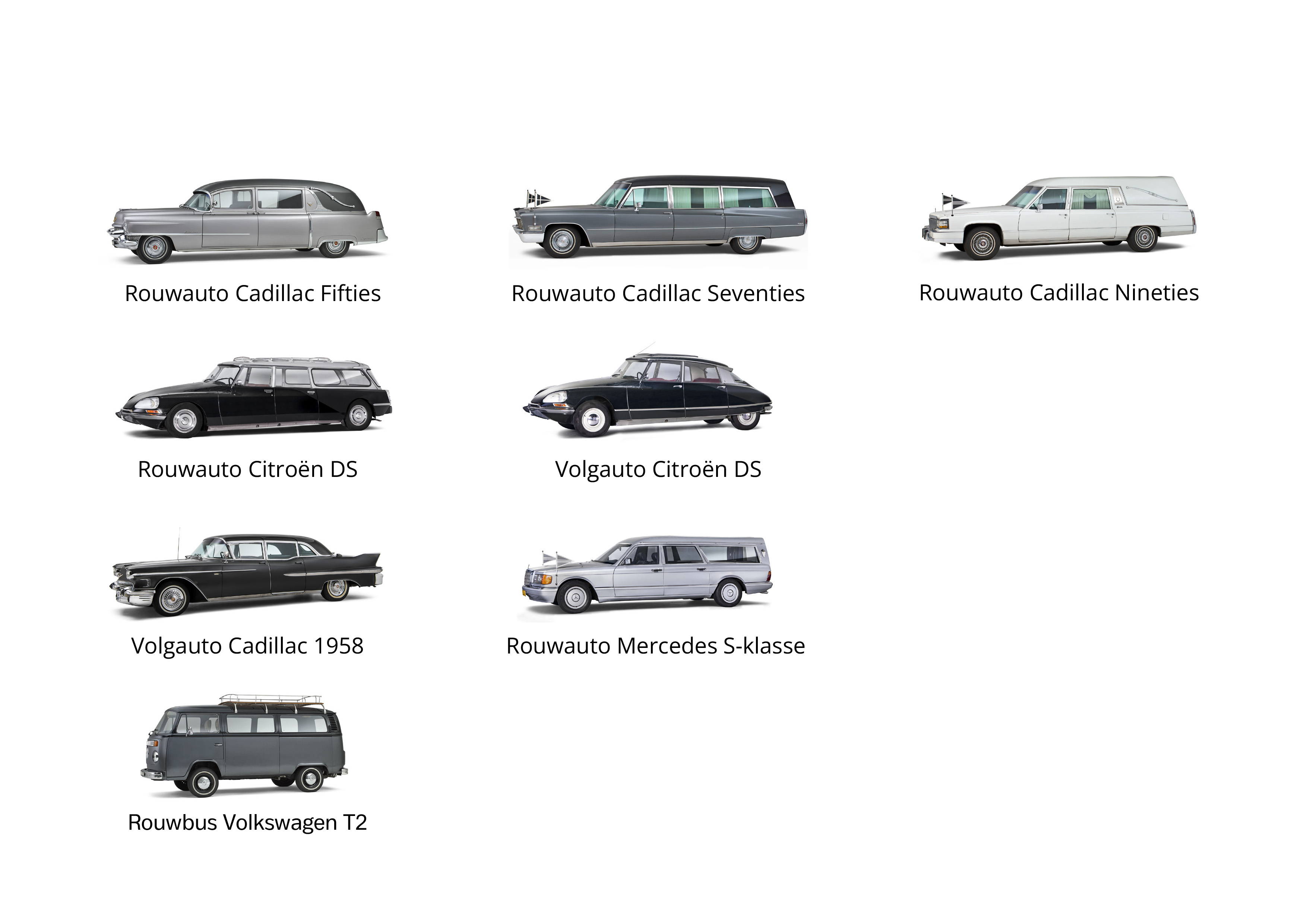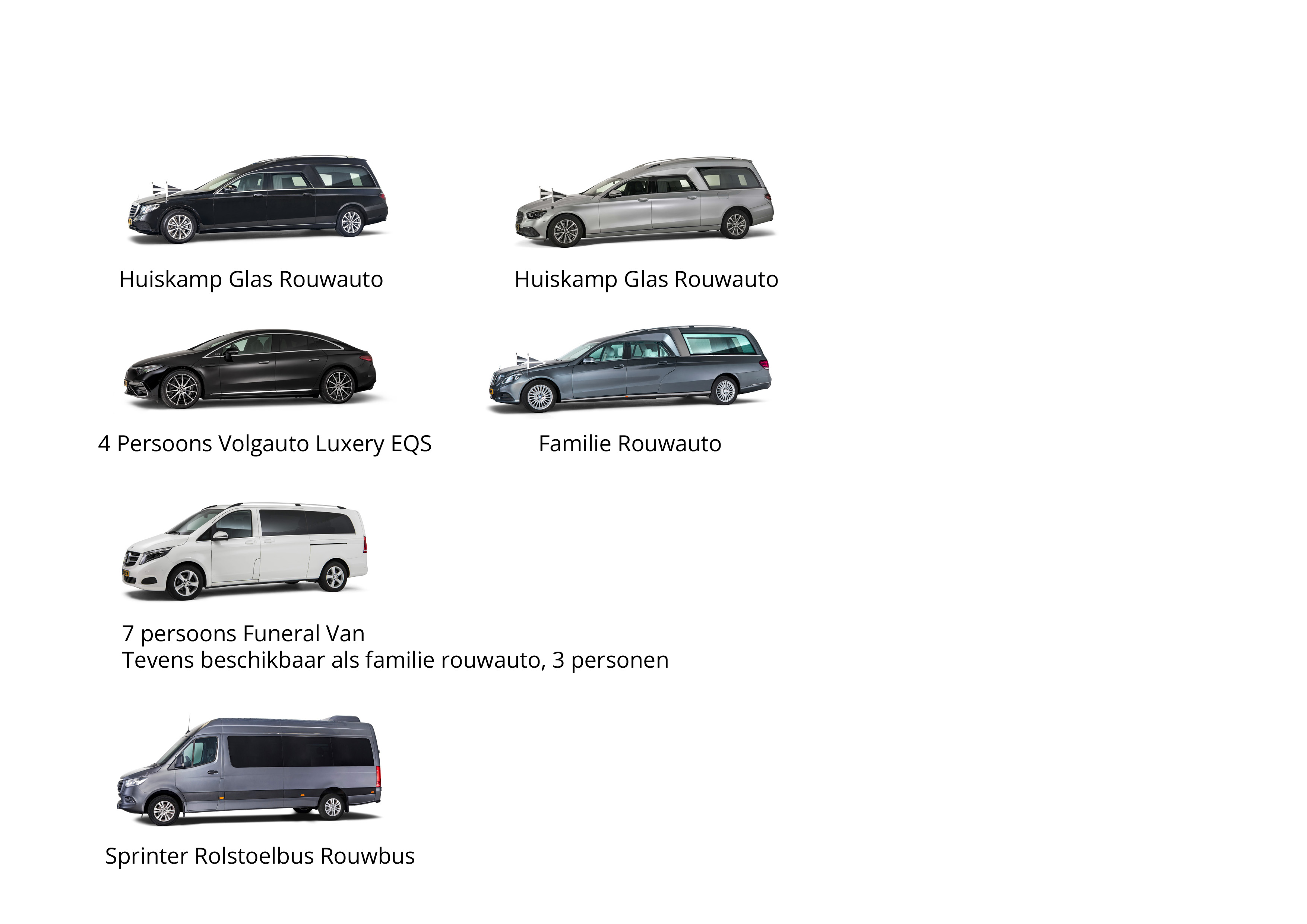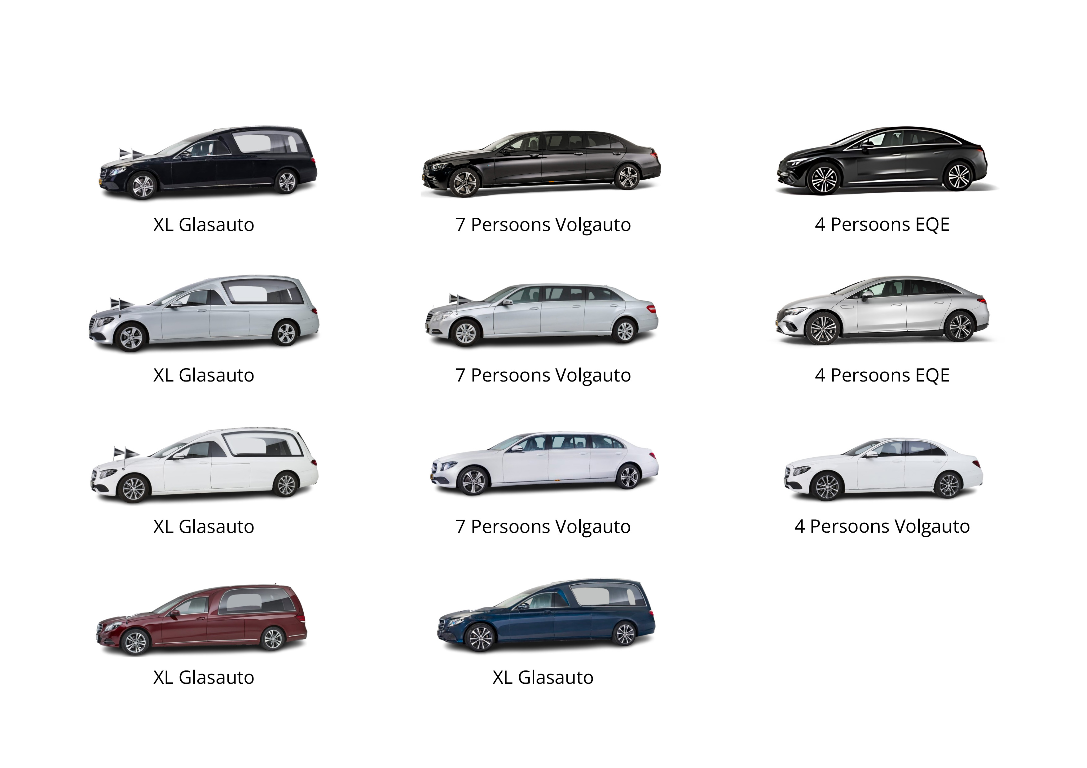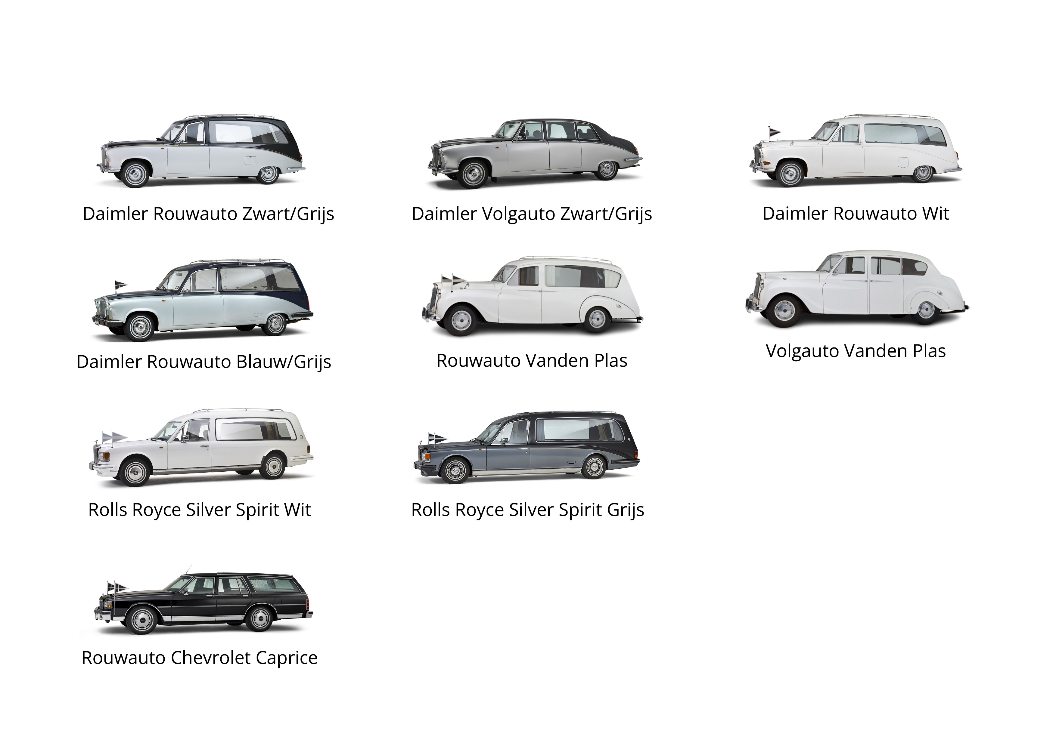 U kunt kiezen uit verschillende rouwauto’s. Hieronder een overzicht van de verschillende opties. Zoals altijd: bij vragen, schroom niet om meer informatie te vragen aan uw uitvaartleider.